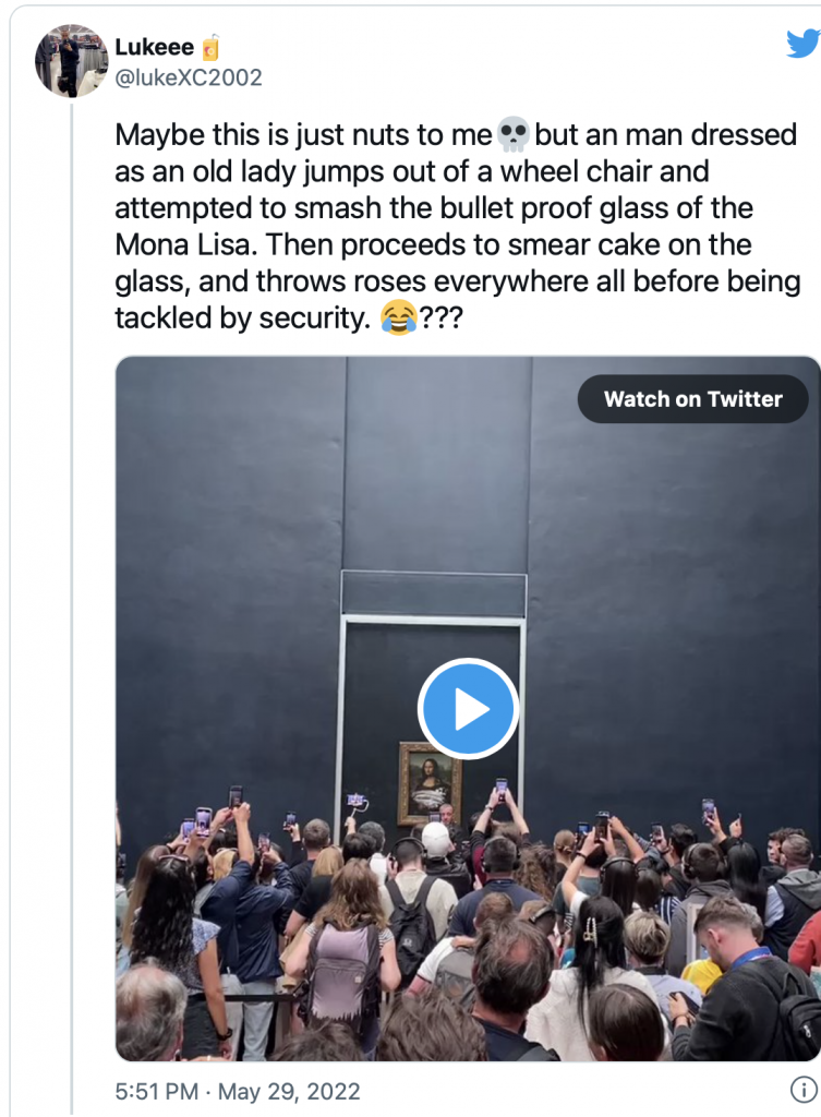 Świat się kończy! Mężczyzna przebrany za creepy staruszkę rzuca ciastem w obraz Leonarda da Vinci. Prosto w tors Mona Lisy.