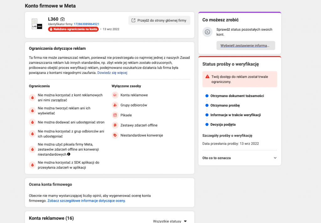 Aby zweryfikować, jaki jest status Twojego konta reklamowego, przejdź do sekcji 'Jakość konta’. W tym polu pojawią informacje o nałożonych ograniczeniach. W takiej sytuacji należy odwołać się od decyzji i poprosić o weryfikację konta reklamowego. Tu nawet FB doradza, co w takiej sytuacji. https://www.facebook.com/business/help/968402779873601 nic z tego nie zadziałało. Jest o tym cały artykuł + kontakt na czacie. Po trzecim razie zablokują wam możliwość kontaktowania się przez czat:(