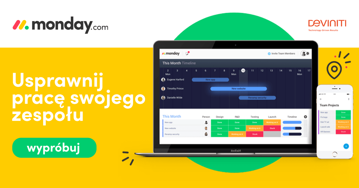 Dziś startujemy z kampania online dla monday.com, jest to jedno z wielu innowacyjnych narzędzi, które znajdziecie w ofercie naszego nowego klienta – Deviniti. Deviniti to software home, który na rynku działa już od 2004 roku, zatrudniając ponad 250 specjalistów, a z ich produktów korzysta ponad 10 000 firm na całym świecie.