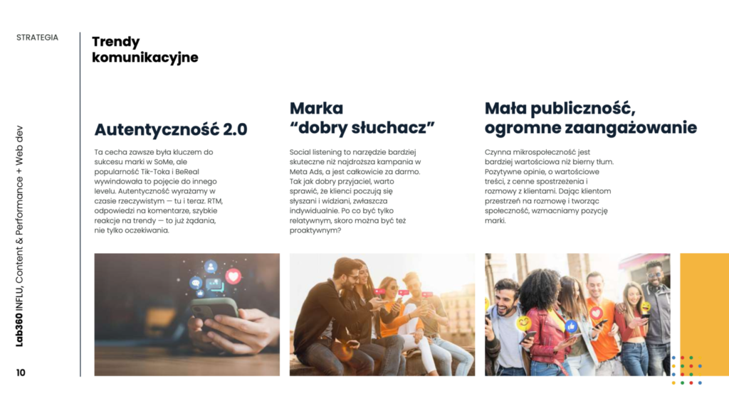 3. Wykorzystanie trendów społeczno-kulturowych i komunikacyjnych: zwracamy uwagę na znaczenie zrozumienia i wdrażania trendów, takich jak prelaunch, outdoors, smart home, self-improvement, autentyczność, social listening, i tworzenie mikrospołeczności. Strategia komunikacji musi uwzględniać te trendy, aby skutecznie docierać do grup docelowych i budować zaangażowanie​.