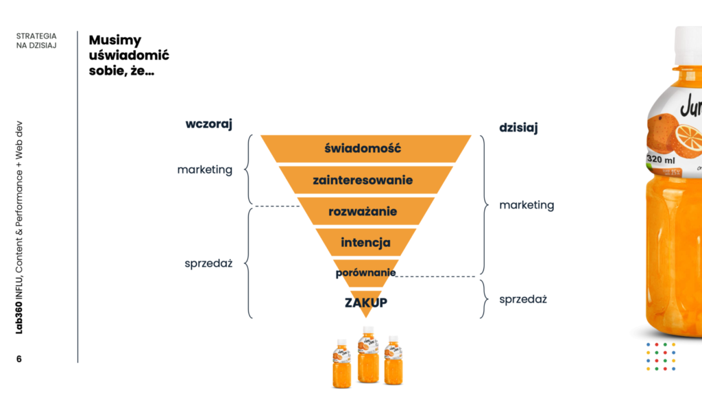 1. Zmiana w procesie decyzyjnym konsumentów: Porównanie „wczoraj” i „dzisiaj” w strategii pokazuje ewolucję procesu zakupowego, który obecnie wymaga bardziej zintegrowanego podejścia marketingowego i sprzedażowego. Zmiany te wskazują na konieczność adaptacji strategii komunikacji do nowych realiów, gdzie świadomość, zainteresowanie, rozważanie, intencja i porównanie są kluczowymi etapami przed zakupem​.